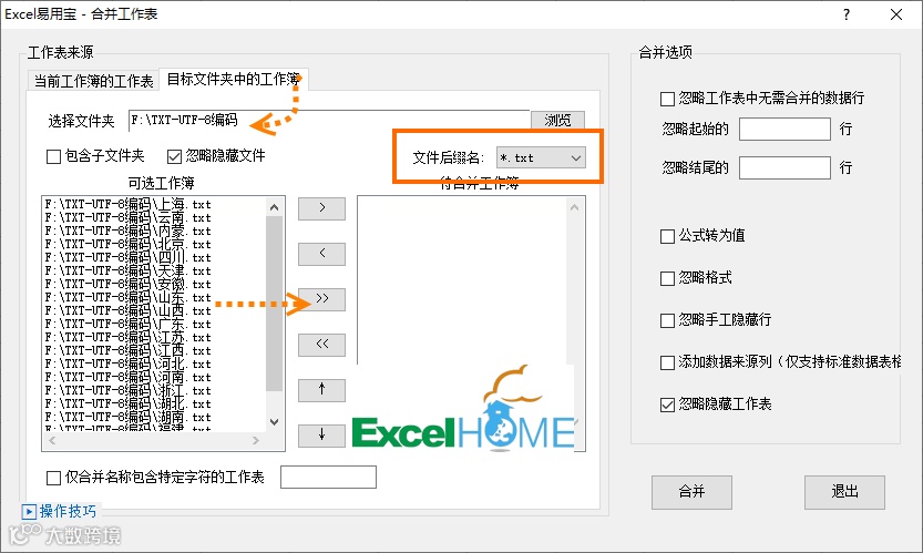 选择目标文件夹中的工作簿,浏览到存放TXT文件的文件夹,文件后缀名选择TXT文件,将可选工作簿添加到待合并工作簿区域。