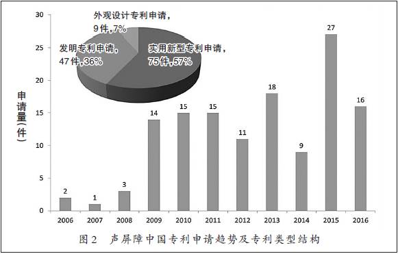 笔者经检索发现,申请人在中国提交的高铁系统用声屏障相关专利申请为131件,其中以实用新型专利申请为主(详见图2)。从专利申请趋势来看,声屏障专利申请始于2006年,当年专利申请量为2件,近年来总体呈现增长趋势,2015年达到27件。从申请人来看,主要申请人为铁道第三勘察设计院集团有限公司(9件)、成都市新筑路桥机械股份有限公司(8件)及四川正升声学科技有限公司(6件)等。