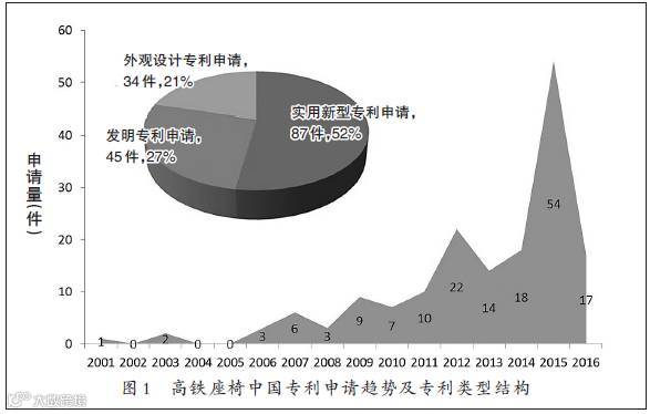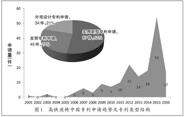 座椅应该是高铁中最能体现人性化设计的部件之一。笔者经检索发现,申请人在中国提交的高铁座椅相关专利申请为166件,自2001年以来呈增长趋势,2012年开始增速提升,2015年达到54件(详见图1)。这些专利申请以实用新型专利申请为主。从申请人来看,上海坦达轨道车辆座椅系统有限公司提交的专利申请最多(13件),其次是江阴杰森轨道车辆设备有限公司(9件)、上海交运汽车精密冲压件有限公司(9件)、西南交通大学(8件)和南车青岛四方机车车辆股份有限公司(8件)。