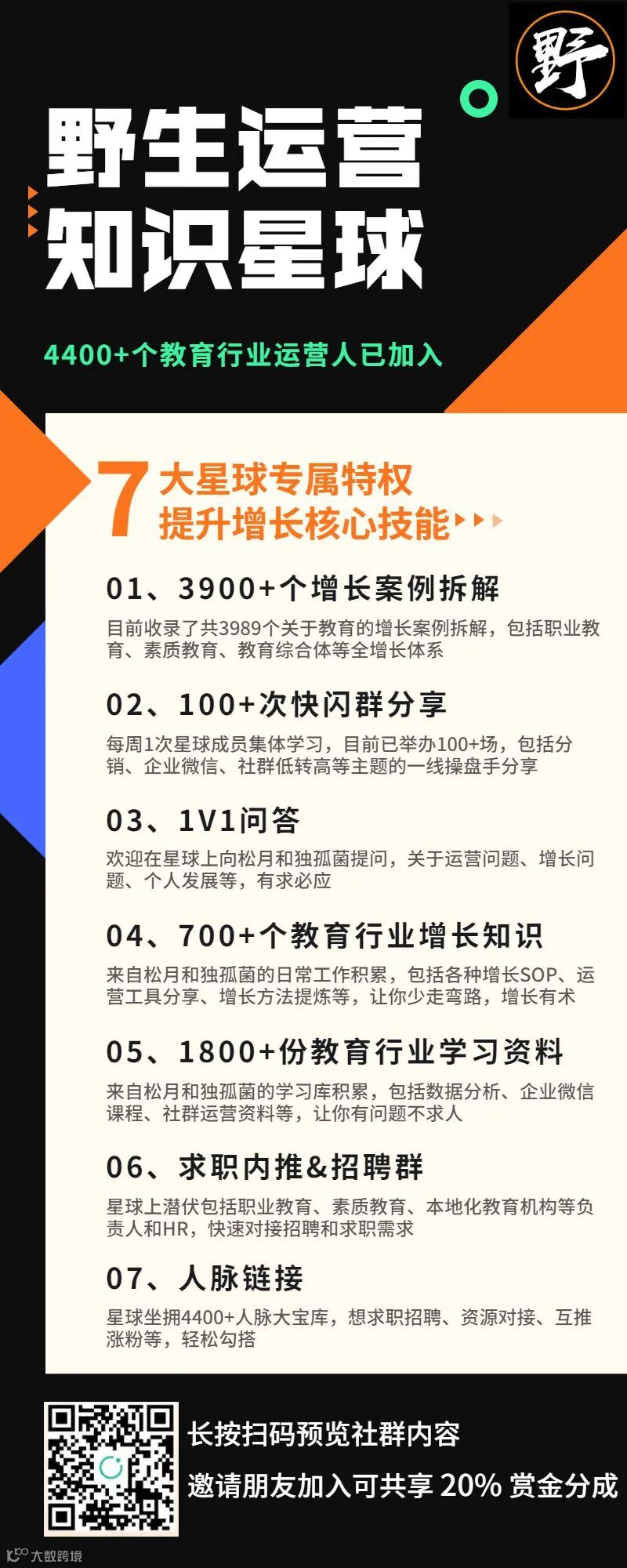 欢迎加入野生运营星球,每周一次快闪分享、教育圈一手资料、1V1答疑……等硬核干货,而且还能一次入手包括 《2021上半年教育圈增长案例合集》、3989 个在线教育圈案例合集全库、100+ 场群分享的音频+逐字稿、N多运营工具包和资料,就问你一句,值不值?