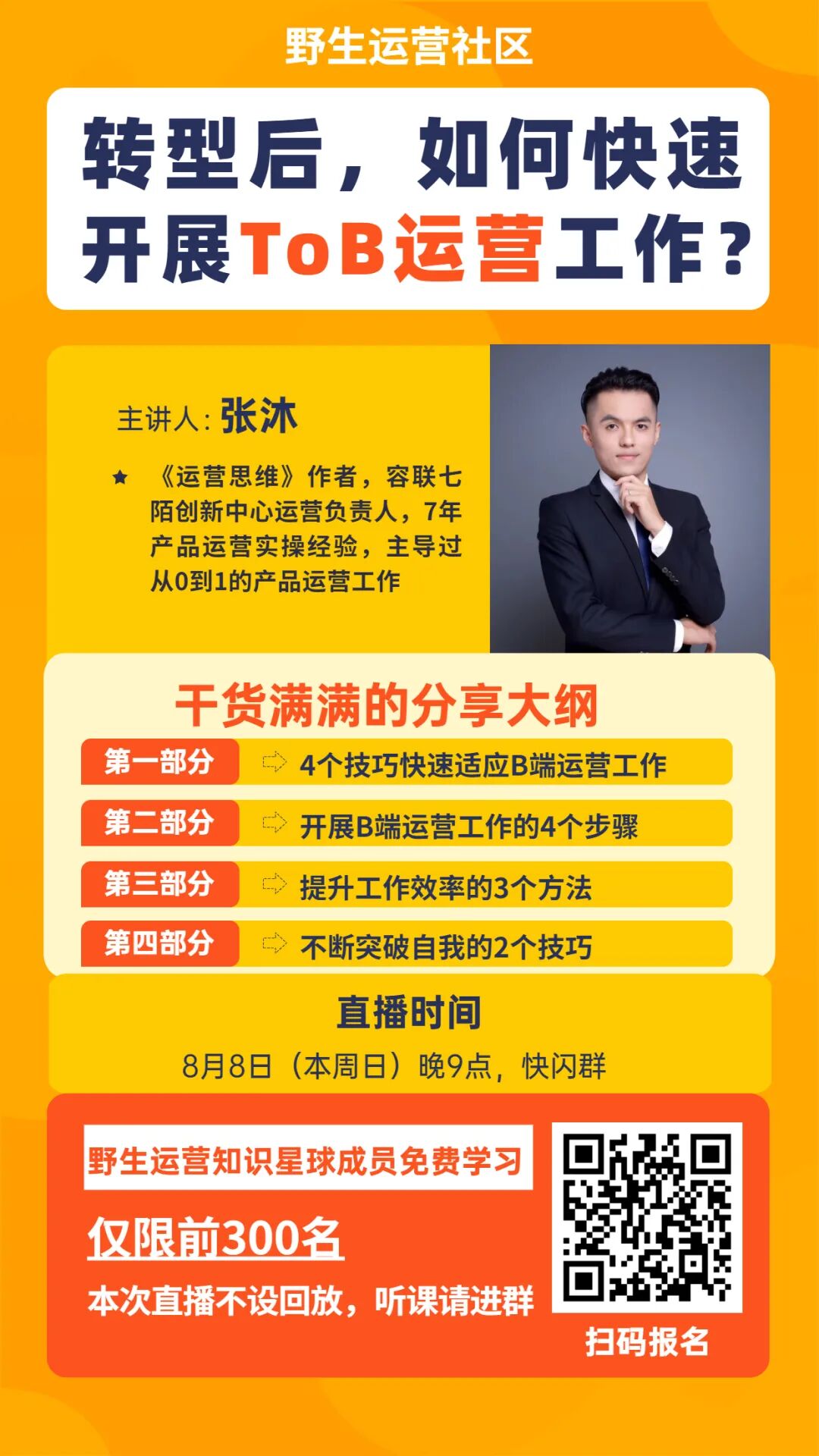 本周日晚9点,我邀请张沐老师,《运营思维》作者,容联七陌创新中心运营负责人,7年产品运营实操经验,主导过从0到1的产品运营工作,带来分享《转型后,如何快速开展ToB运营工作》本次分享不设回放,感兴趣的扫码报名,报名截止本周日(8月8日)晚8点。如果你觉得本次课程有价值,欢迎把海报分享给更多有需要的小伙伴哦,感谢❤