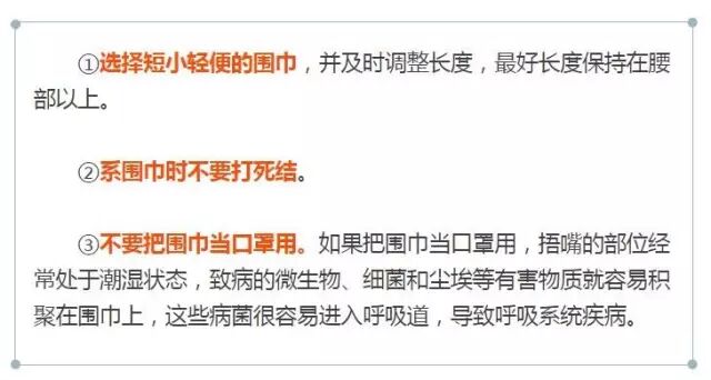 骑车或乘坐电梯时,一定要把围巾系好,下垂部分不要留得太长,否则围巾一旦被绞进车轮或电梯里,另一端就会勒住脖子,可能根本连发声求救的机会都没有。