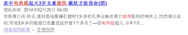 无独有偶。一位江苏南京的94岁老人因整夜开着电热毯睡觉,引发大火,当救护车赶到时,老人已经被烧死。