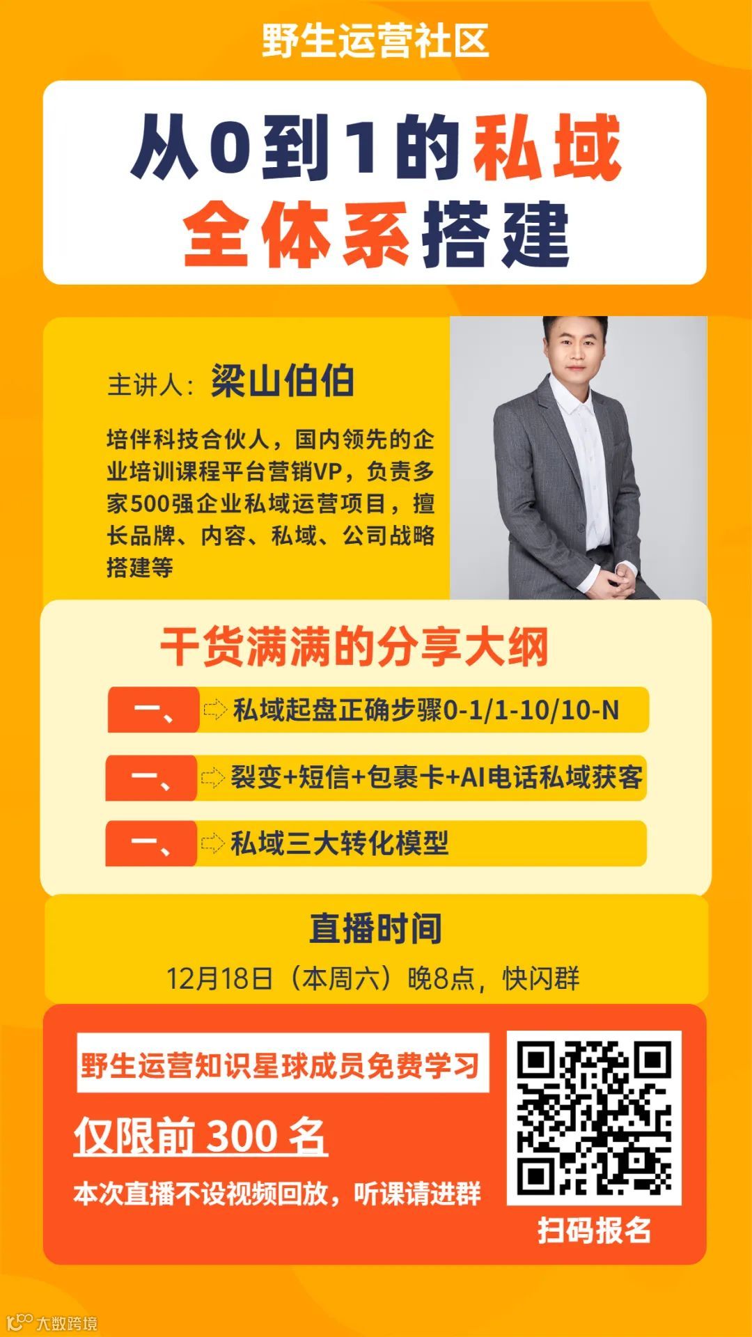 本周六晚8点,我邀请梁山伯伯,培伴科技合伙人,国内领先的企业培训课程平台营销VP,负责多家500强企业私域运营项目,带来快闪分享《从0到1的私域全体系搭建》,本课程适合公司私域运营负责人,及私域操盘手来听。感兴趣的小伙伴扫码报名,本次分享不设视频回放,报名截止本周六(12月18日)晚7点。