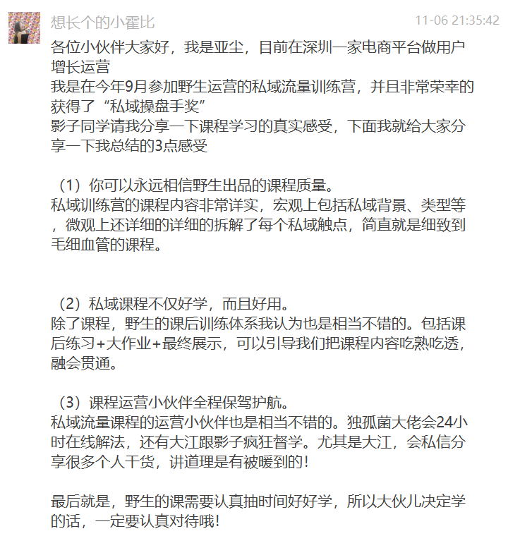 目前这个私域训练营凝结了野生运营当下对互联网私域运营的认知精华,推荐大家积极报名学习,未来能更好跟上野生运营的脚步,让咱们继续在运营的路上,继续探索,一路狂奔!