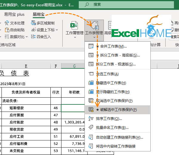 点击Excel易用宝,工作表管理,破解选中工作表保护。