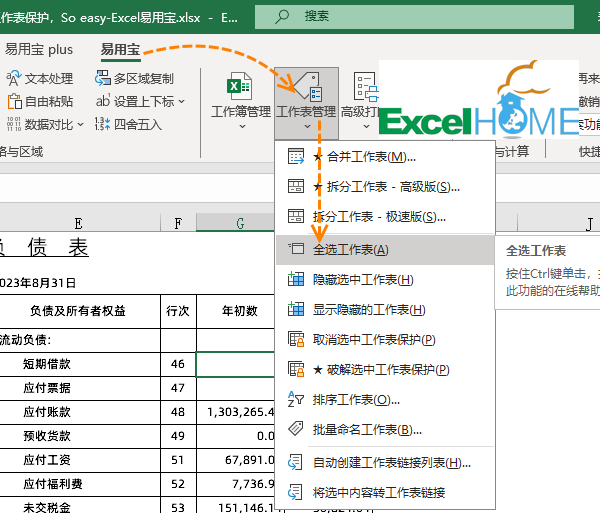 如果有很多张工作表有保护密码,需要批量处理,可以先点击Excel易用宝,工作表管理,全选工作表,然后再点击破解选中工作表保护就OK了。