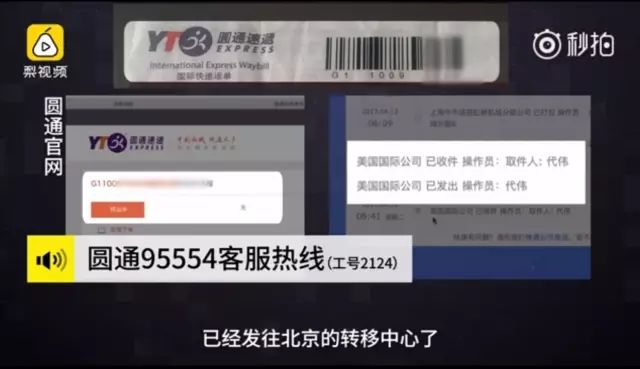 记者亲自测试所购“假单号”,圆通某快递单号显示:“美国国际公司 已收件,已发出,已经发往北京的转移中心……”