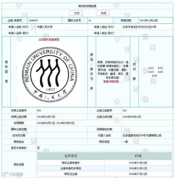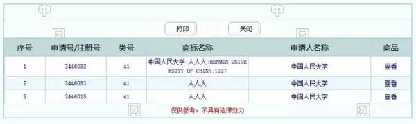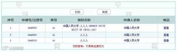 那么该商标为什么能注册成功呢?就如文章开头所说。中国人民大学在第41类教育类别注册的商标到期了,没有续展。