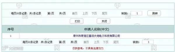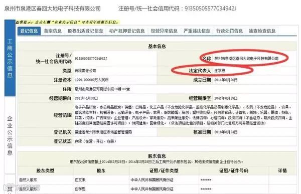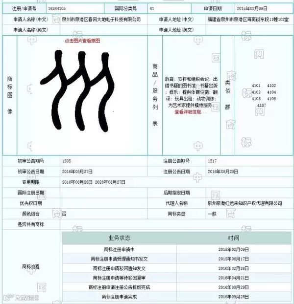 根据微博曝光的商标号,查询中国商标网,能看见曝光信息是真实有效的。商标申请人为泉州市泉港区春回大地电子科技有限公司。下面为具体注册信息。