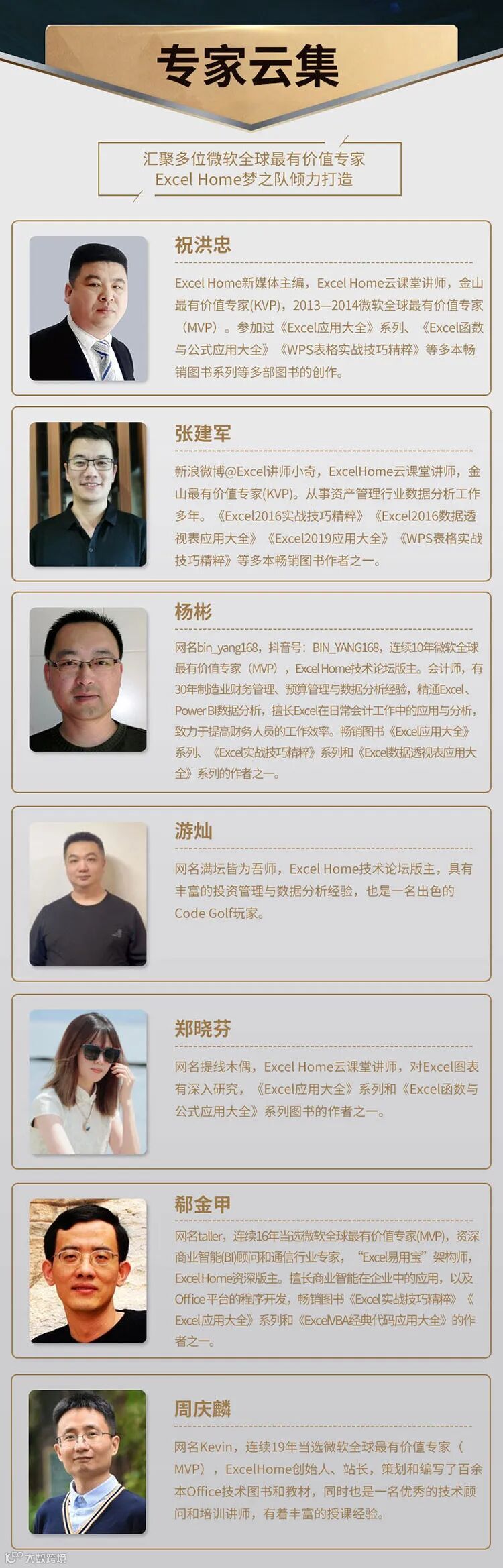 八位作者都是实战派,每个人是在工作岗位和Excel技术论坛上一路摸爬滚打过来的,所以他们写的内容从一开始就有深深的实战烙印,有了他们的带领,大家可以用完美路径进行学习,轻松避坑。