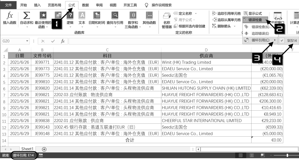 由于公式中引用了 E14 自身的值,公式无法得出正确的计算结果,结果显示为 0,并且在状态栏的左下角出现文字提示“循环引用:E14”。