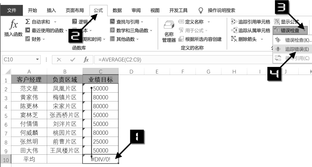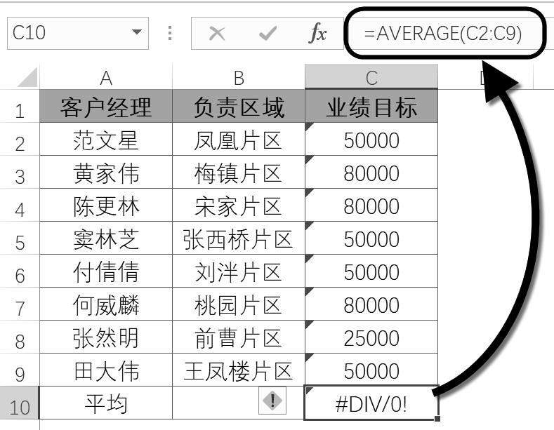 如图 1-3 所示,在 C10 单元格使用 AVERAGE 函数计算 C2:C9 单元格的平均值,但结果显示为错误值“#DIV/0!”。