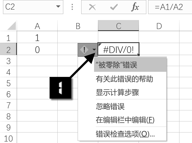 当单元格中的公式或值与上述情况相符时,单元格左上角将显示一个三角形智能标记。选定包含该智能标记的单元格,单元格左侧将出现感叹号形状的【错误提示器】下拉按钮,扩展菜单中包括公式错误的类型、关于此错误的帮助、显示计算步骤等信息,如图 1-2 所示。