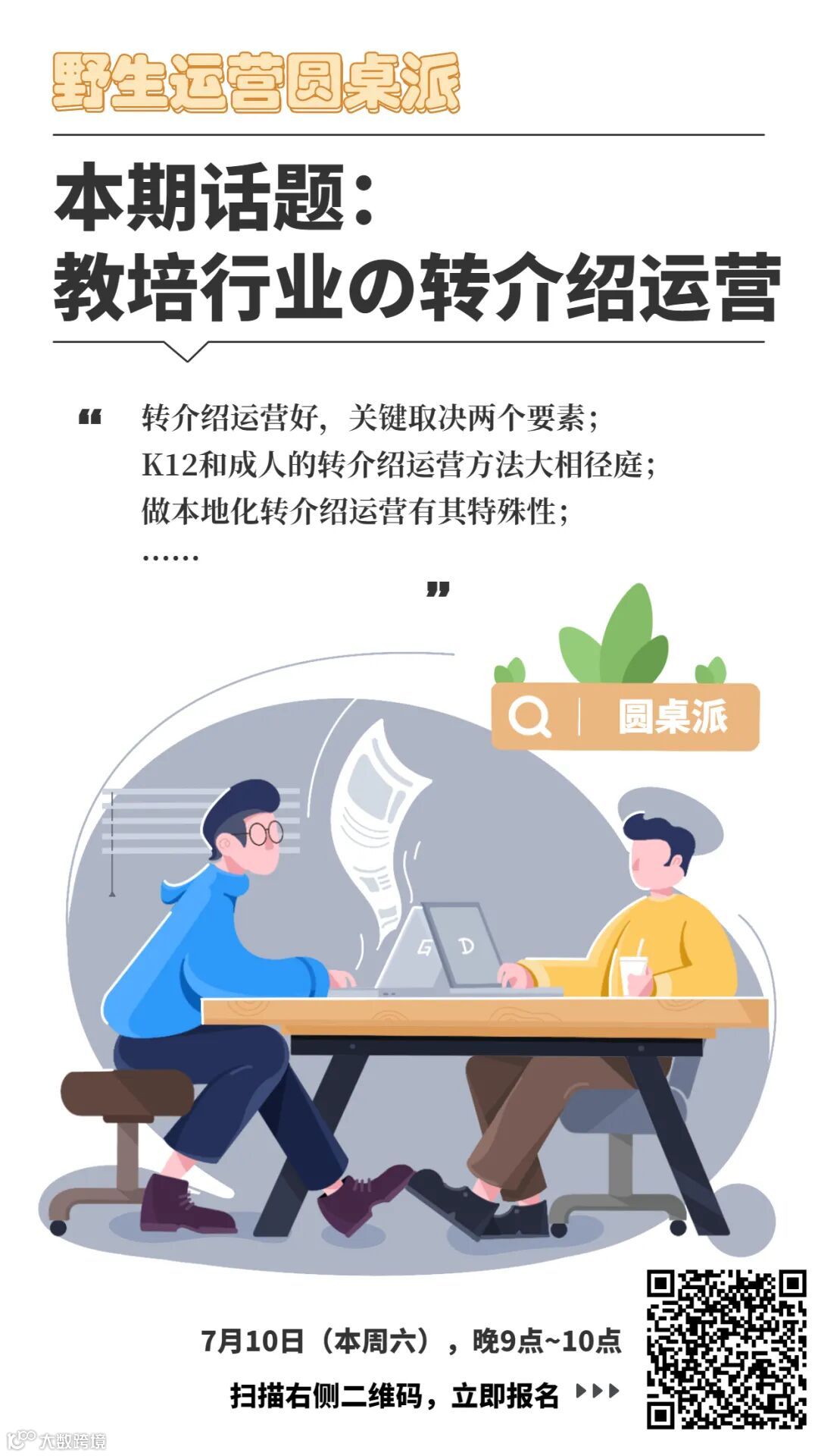 本周六(7月10日)晚9点,野生运营线上圆桌开启【转介绍】专场,报名截止本周五(7月9日)24点,想参与圆桌分享的小伙伴扫码报名啦~