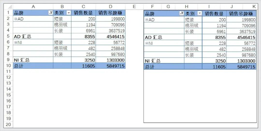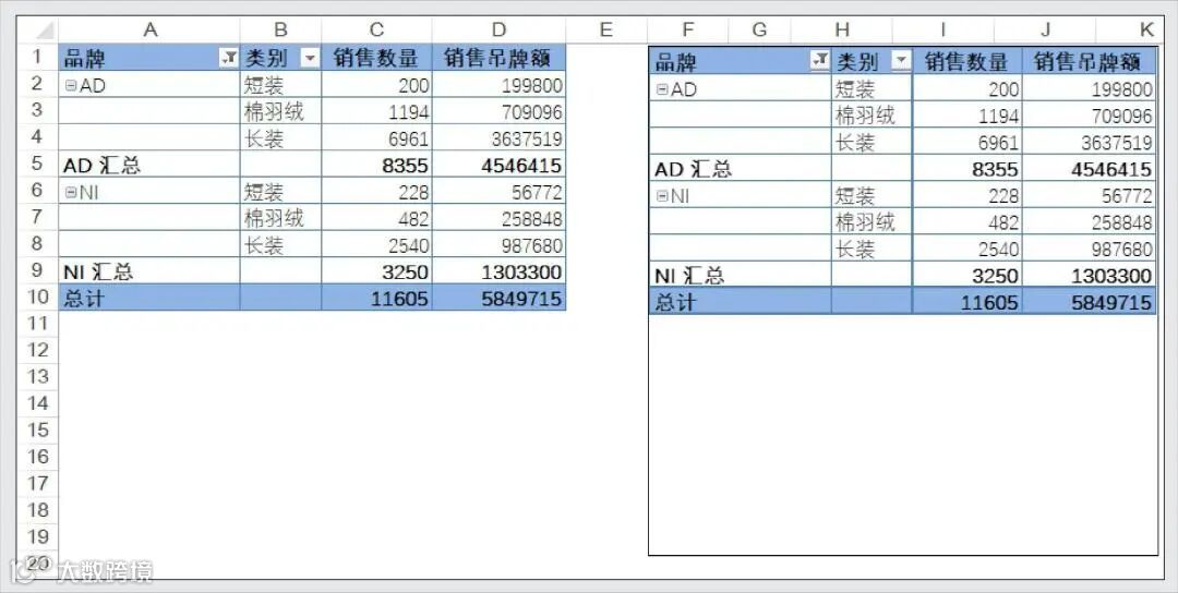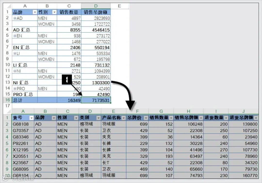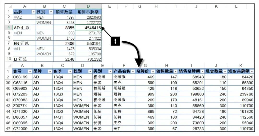 仍以图6所示的数据透视表为例,如果希望查询品牌为“AD”的所有明细数据,只需用鼠标双击数据透视表中“AD 汇总” 行的最后一个单元格D4 即可,如图9所示。