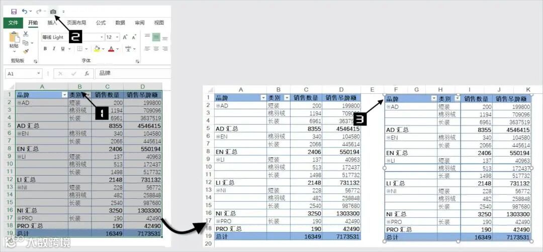 选中数据透视表中的A1:D19 单元格区域,单击【自定义快速访问工具栏】中的【照相机】按钮,随后单击数据透视表外的任意单元格(如F1),得到如图3所示的A1:D19 单元格区域的图片。