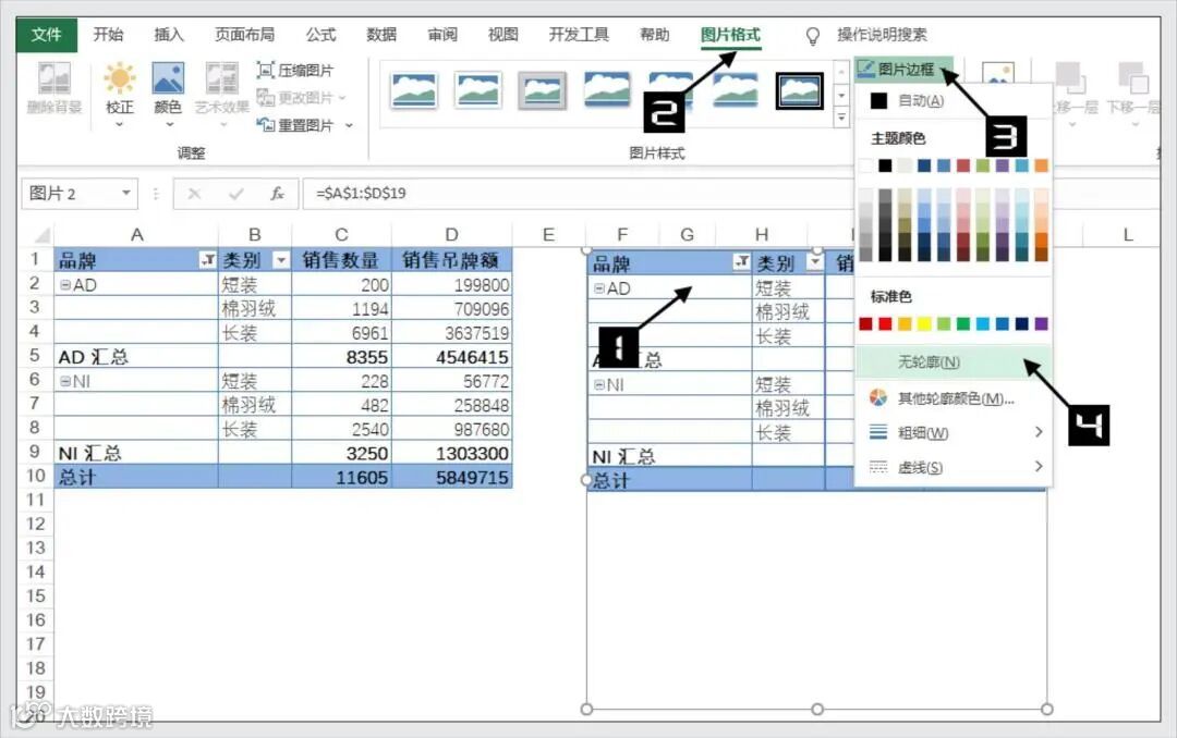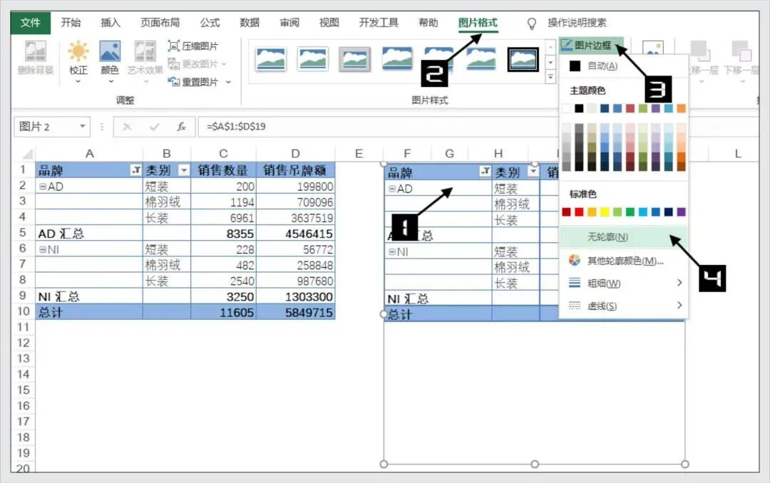 影子数据透视表默认会有外边框,用户可将边框去掉,以使影子数据透视表的显示更加美观。选中影子数据透视表,单击【图片格式】选项卡→【图片边框】按钮,在弹出的下拉菜单中选择【无轮廓】命令即可,如图5所示。