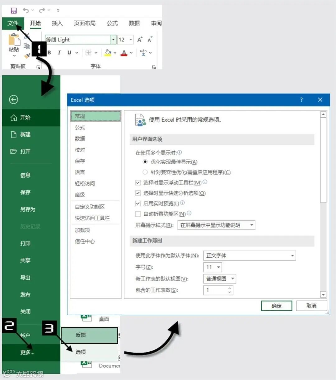 单击【文件】→【更多】→【选项】,调出【Excel 选项】对话框,如图1所示。
