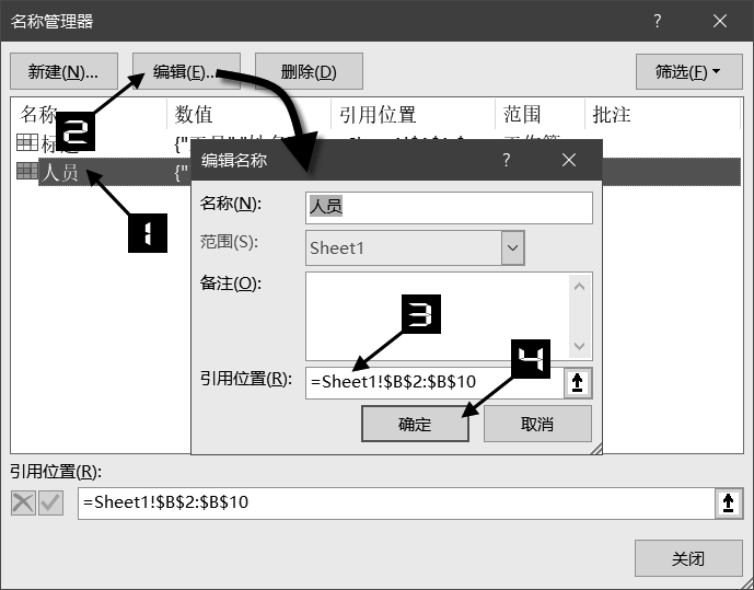 单击列表框中已定义的名称,再单击【编辑】按钮,打开【编辑名称】对话框,可以对已定义的名称修改命名或是重新设置引用位置,如图 1-4 所示。