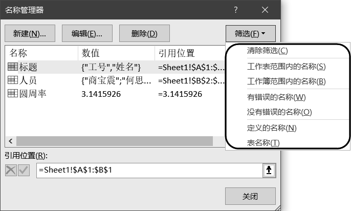 【名称管理器】具有筛选器功能,单击右上角的【筛选】按钮,在下拉菜单中按不同类型划分为三组供用户筛选:“工作表范围内的名称”和“工作簿范围内的名称”,“有错误的名称”和“没有错误的名称”,“定义的名称”和“表名称”,如果在下拉菜单中选择【工作表范围内的名称】选项,名称列表中将仅显示工作表级名称,如图 1-3 所示。
