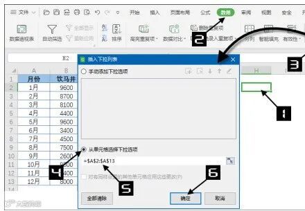 插入下拉列表。选中目标单元格,如H 2 单元格,然后依次单击【数据】→【插入下拉列表】按钮。在弹出的【插入下拉列表】对话框中,选中【从单元格选择下拉选项】单选按钮,选择A 2 :A 13 单元格区域,最后单击【确定】按钮,如图 18 - 8 所示。