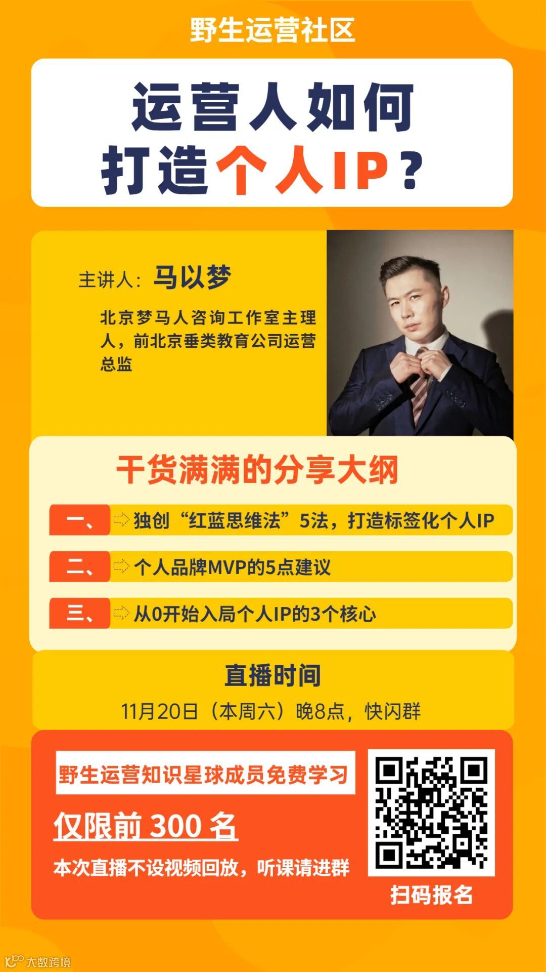 移动互联网时代,每个人都有发声的机会和渠道,如何输出带有个人标签的观点,从而占据人们心智,并且持续给别人带来正向价值,是不少运营人一直在探索的课题。本周六晚8点,我邀请以梦,北京梦马人咨询工作室主理人,带来分享《运营人如何打造个人IP》。本次分享不设视频回放,报名截止本周六(11月20日)晚7点。