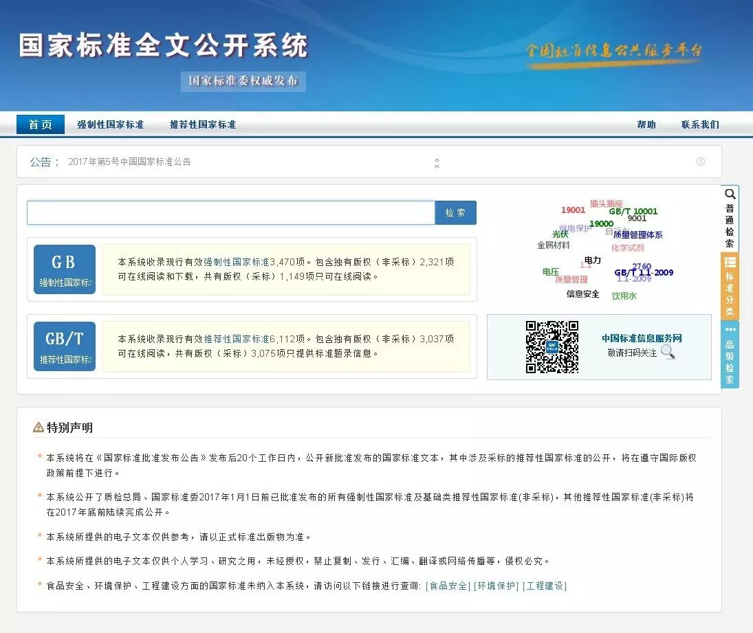 目前,所有强制性国家标准文本3470项和第一批推荐性国家标准文本3037项已经在该系统实现了公开,其他非采用国际(国外)标准的推荐性国家标准将在2017年底前陆续公开。今后,新批准发布的国家标准将在发布后的20个工作日内及时公开,其中涉及采用国际(国外)标准的推荐性国家标准文本在遵守国际(国外)标准组织版权政策前提下进行公开。
