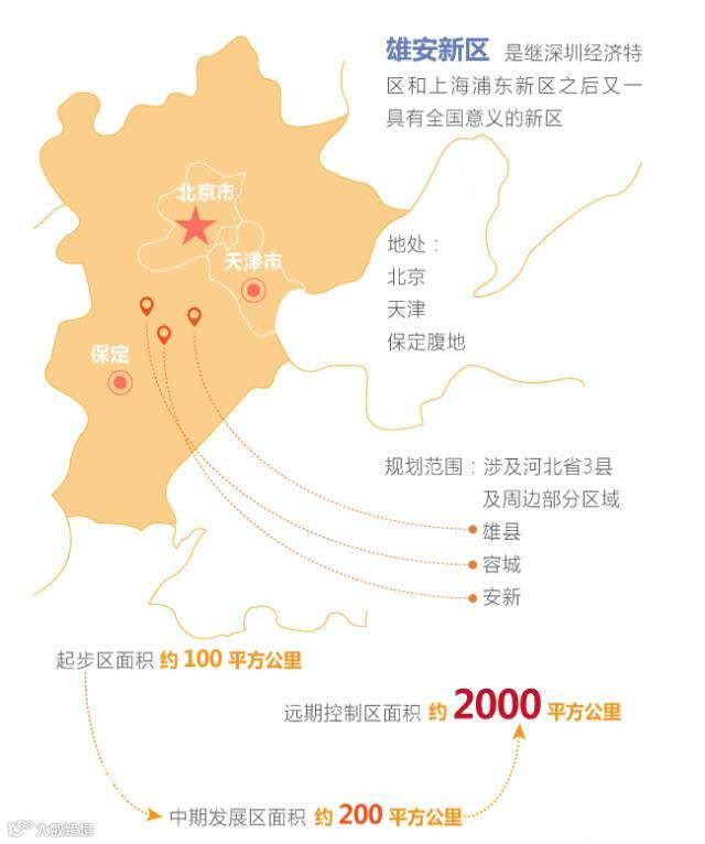 近日,中共中央、国务院印发通知,决定设立河北雄安新区。雄安新区规划范围涉及中国河北省雄县、容城、安新3县及周边部分区域,地处北京、天津、保定腹地,起步区面积约100平方公里,远期控制区面积约2000平方公里。