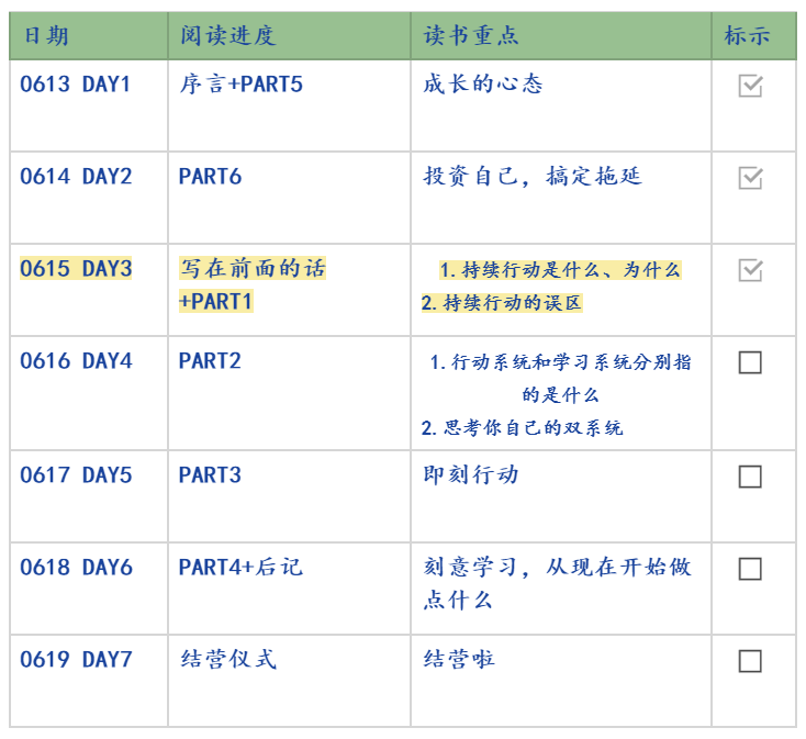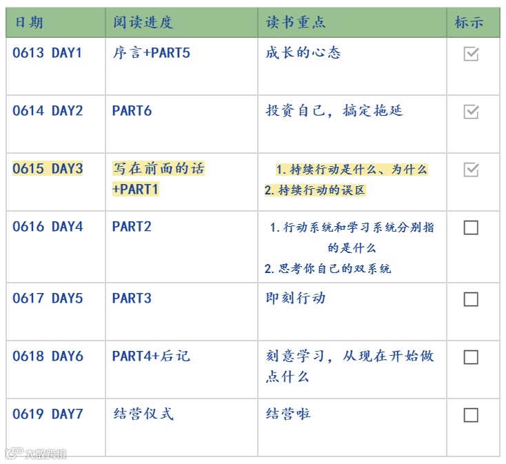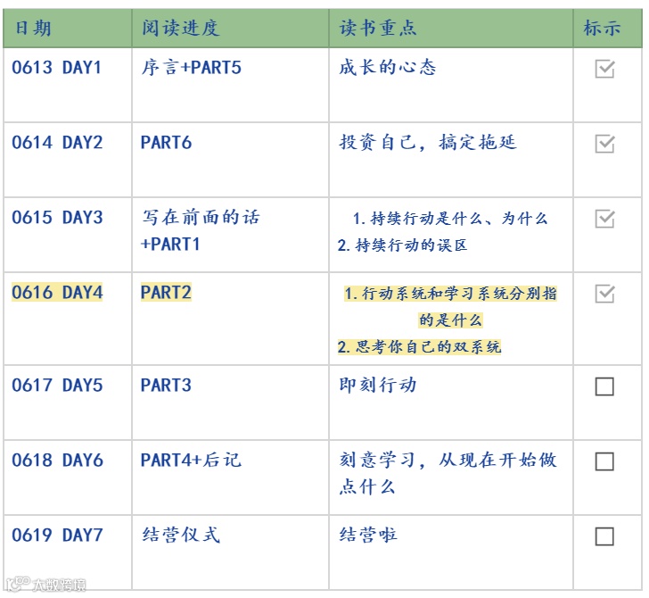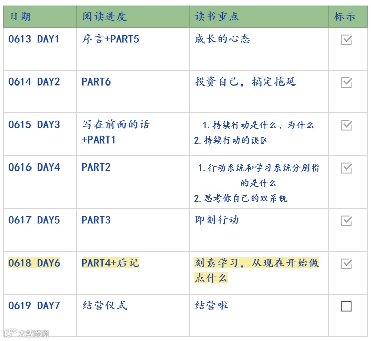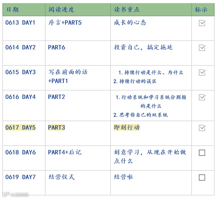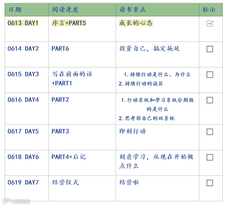 6月13日-6月20日,野生运营读书会结束了第 35 本书《刻意学习》的共读,7 天时间领读人一株仙草带大家读完了全书精华部分。感谢一株仙草的领读《刻意学习》,努力很赞,但没有成果的努力就是在做低水平重复,这本书教你借用数理学科的概念工具去思考和破解个人成长的问题,通过持续行动,依靠行动和学习双系统,实现认知升级,让你实现人生逆袭。