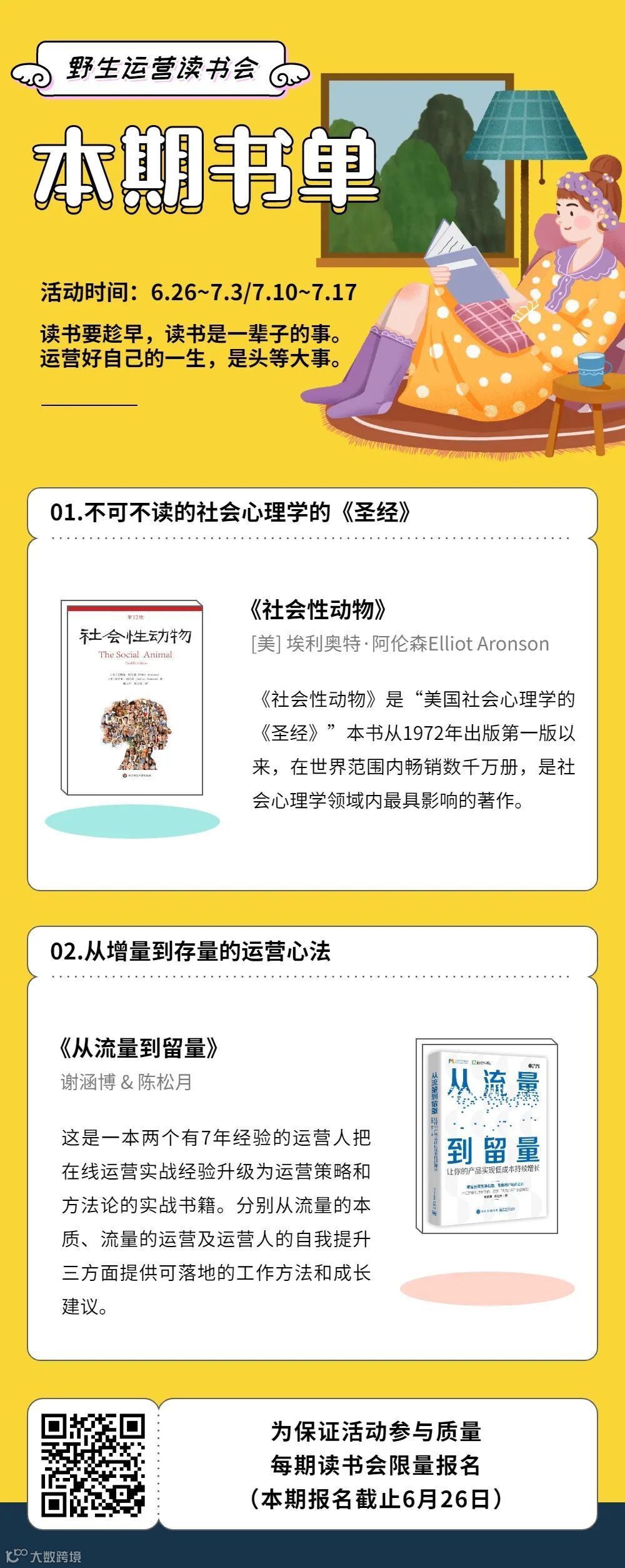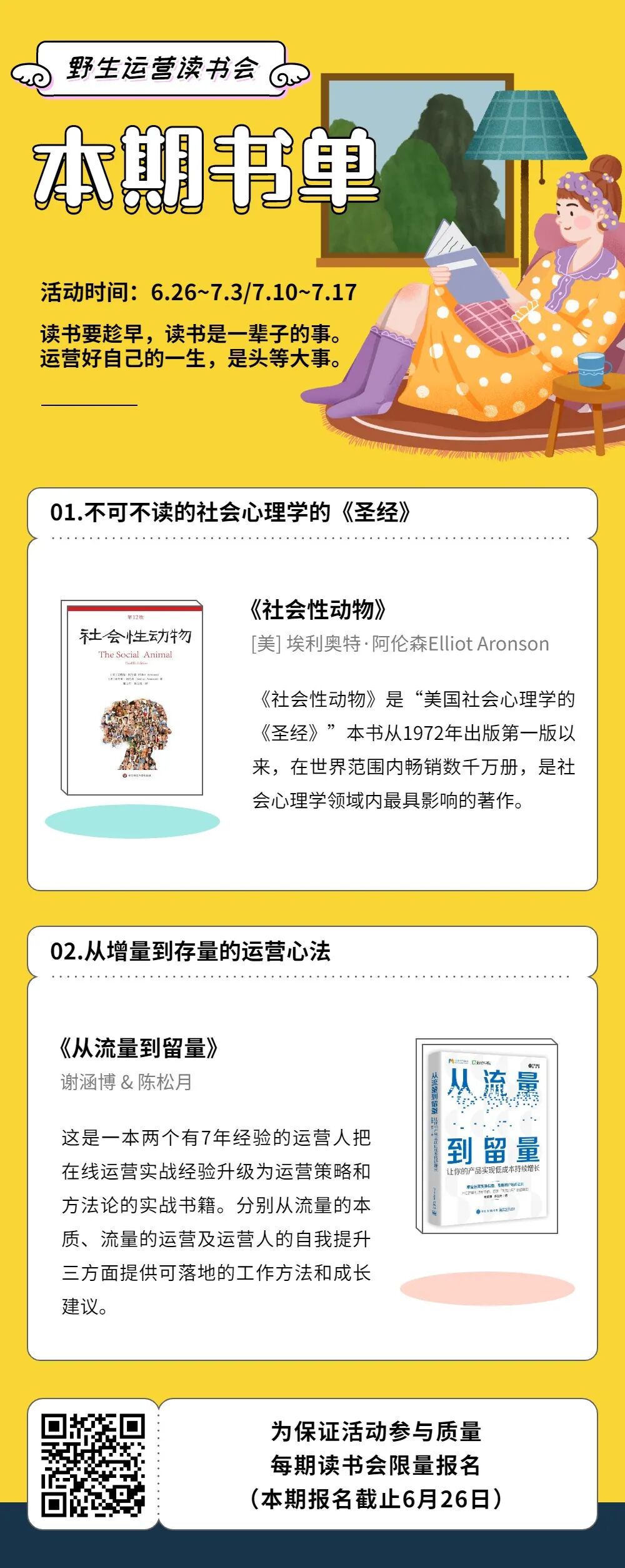 下期读书会我们一起共读《社会性动物》和《从流量到留量》,明天开始共读,报名截止至今晚(6月26日)8点,报名扫码咯: