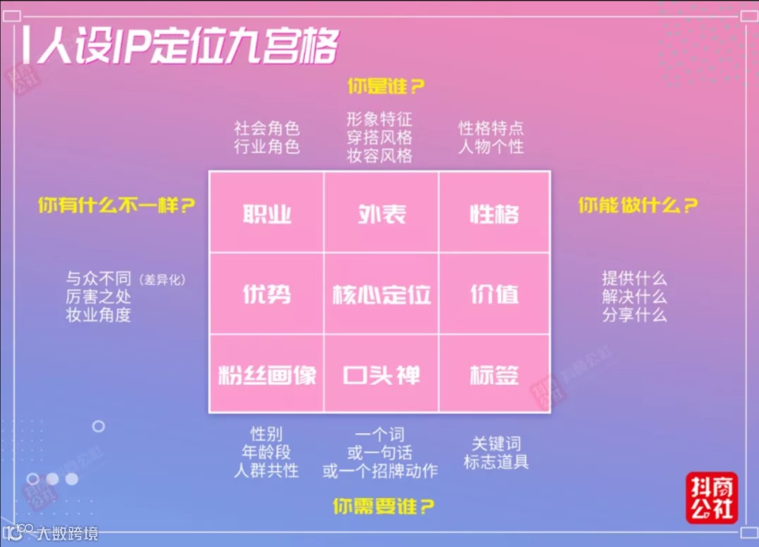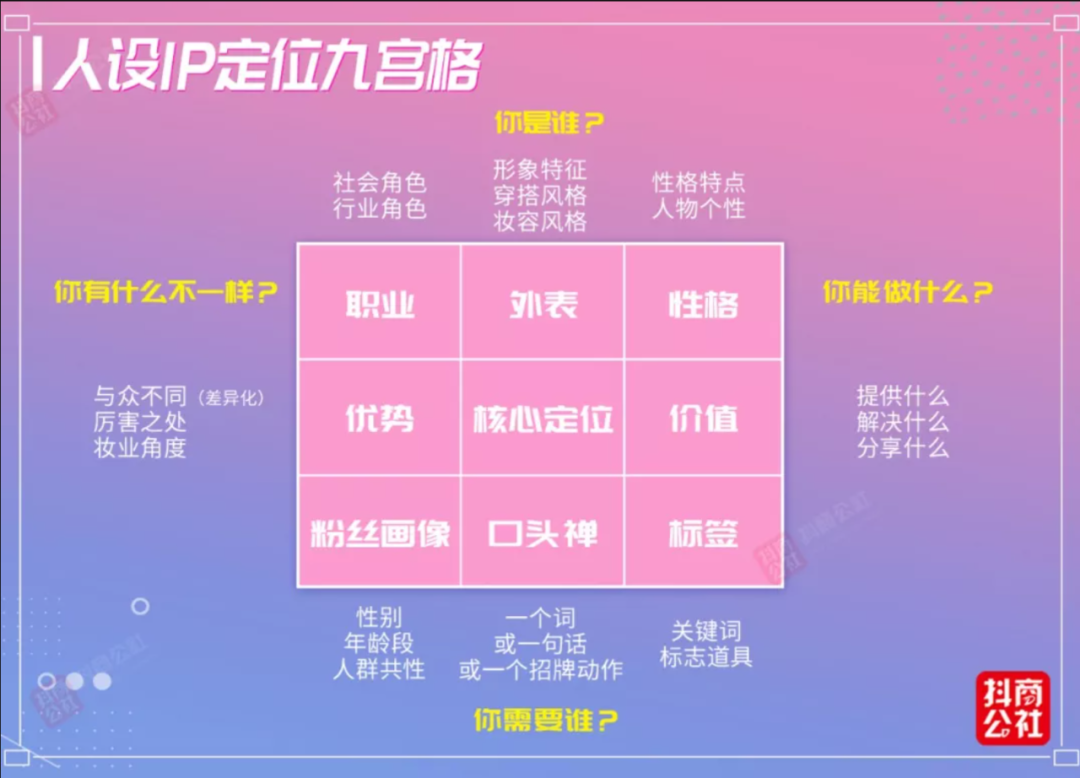 前两天我在网上看到抖商公社出的这个人设IP九宫格思维导图,非常简单易懂好操作,无论你是不是要主播,或者单纯只是想做IP,这个图都能帮你理清思路。