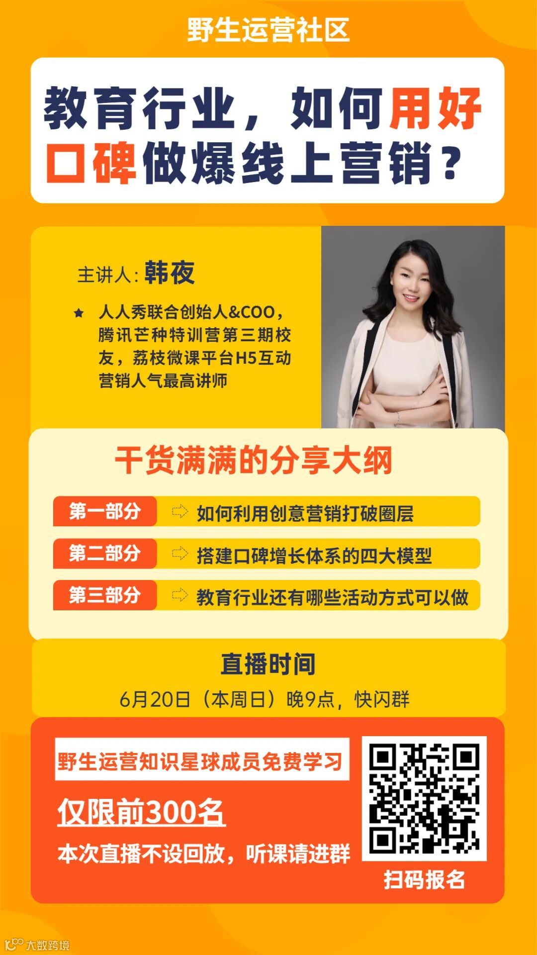 本周日晚9点,我邀请人人秀联合创始人&COO韩夜老师,跟你分享《教育行业,如何用好口碑做爆线上营销?》,本次分享不设回放,感兴趣的扫码报名啦,报名截止本周日(6月20日)晚8点。如果你觉得本次课程有价值,欢迎把海报分享给更多有需要的小伙伴哦,感谢❤