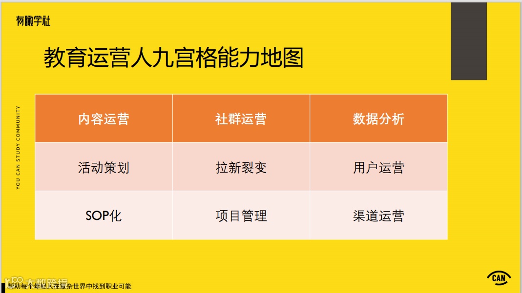 运营是个庞杂的知识体系,先明确你要构建的运营体系到底是什么,可参考我在有瞰学社分享的这张“教育运营人九宫格能力地图”,先选定一个领域。