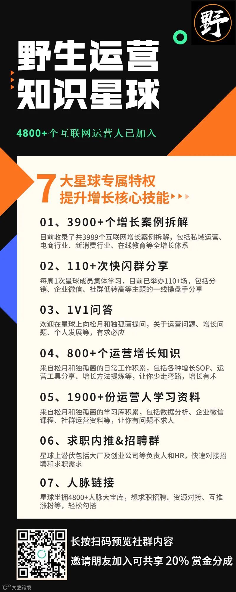 欢迎加入野生运营星球,每周一次快闪分享、运营人学习一手资料、1V1答疑……等硬核干货,而且还能一次入手包括 《2021上半年增长案例合集》、3989 个案例拆解全库、110+ 场群分享的音频+逐字稿、N多运营工具包和资料,就问你一句,值不值?