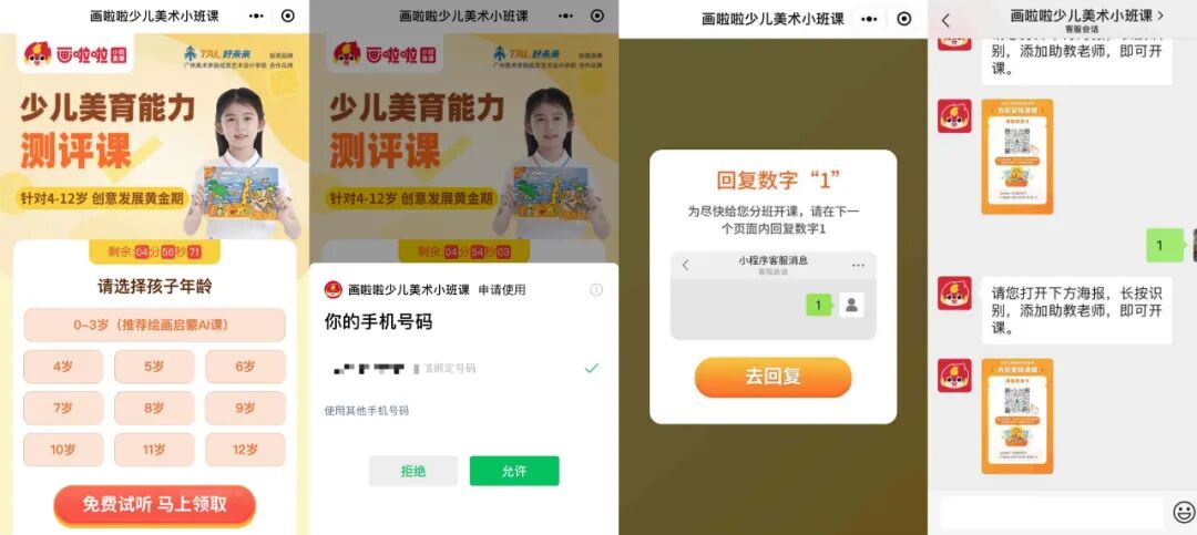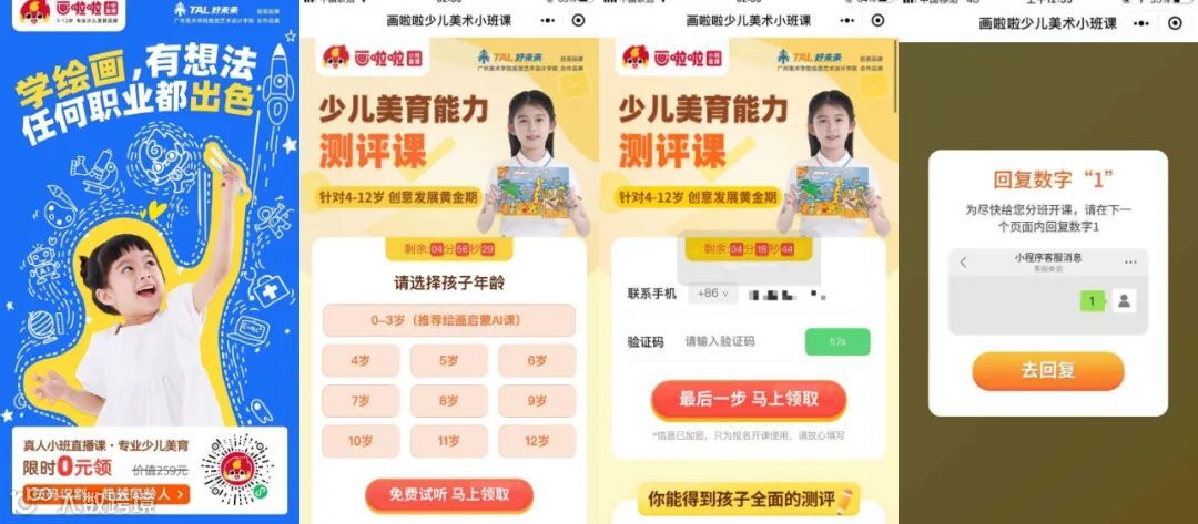 画啦啦少儿美术的“0.1元体验和3.9元体验课”都包含1节直播体验课+1份点评+课后辅导,其中3.9元的包含了9节录播课,不清楚是否在进行A/B测试,以及0.1转高价、3.9转高价转化率是否会后者更高?毕竟0元的用户损失成本更低,这点要结合数据才能得出结论