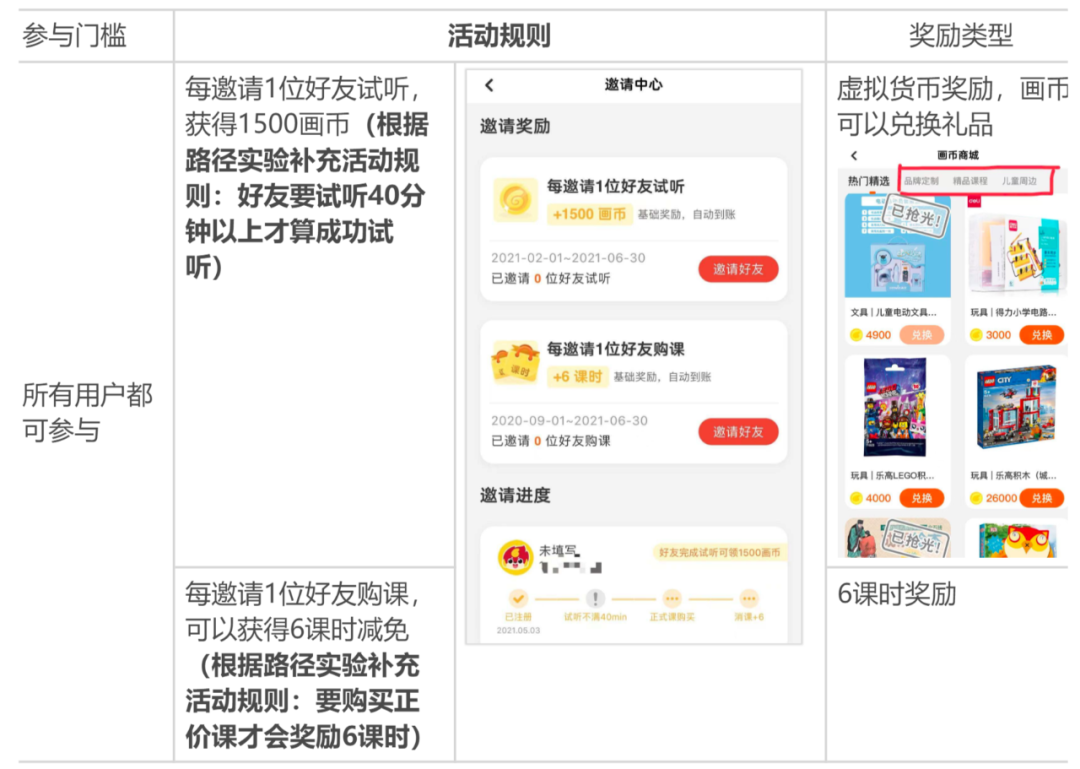 i 有设定阶梯性奖励,且每个奖励都有分享按钮,同时有邀请进度提醒,奖励也是自动到账,减少了用户的疑虑。但没有活动规则的系统性说明,好友购课有奖没有说清楚购什么样的课有奖励(邀请后的进度有说明,但这一信息是在邀请后出现,用户邀请前没有明文解释,这样会打击用户的积极性),以及画币的价值性没有能很好体现出来,比如画币是兑换各种礼品,那可以在活动页面放个画币商城的入口,而不是让用户抽象的看到画币,如果是新用户,对画币用途陌生,那这个邀请奖励就完全失去了价值,并不能提高用户分享的频次