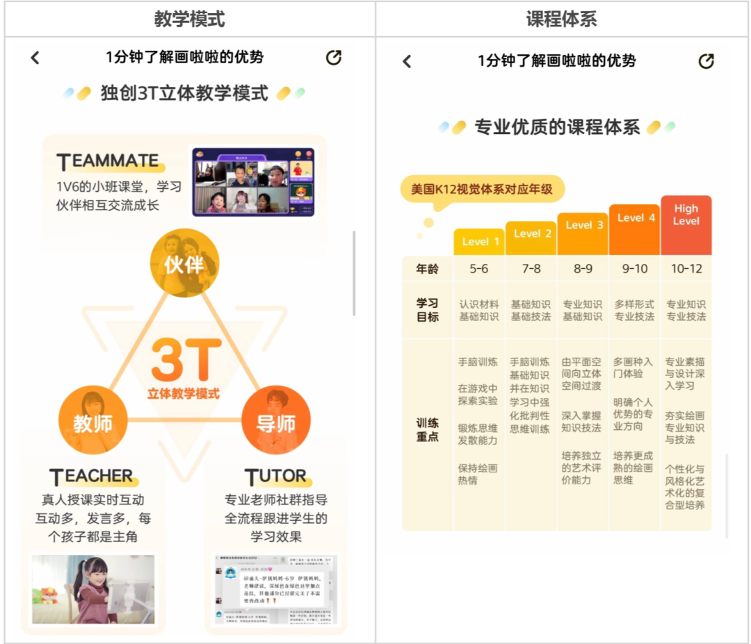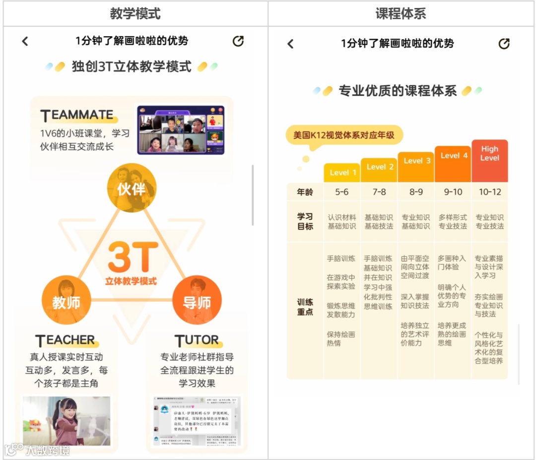 画啦啦少儿美术,成立于2015年,面向5-12岁儿童,采用1v6小班直播课形式,目前微信公众号覆盖300万家庭,有超过50万用户进行了付费