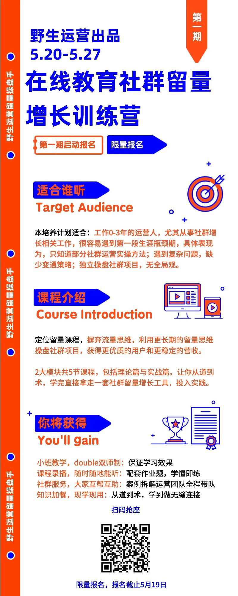 野生运营第二期系统课正式上线,结合在线教育行业优秀案例,打磨成本次社群增长训练营,帮学习者快速建立留量认知,具备社群操盘能力。