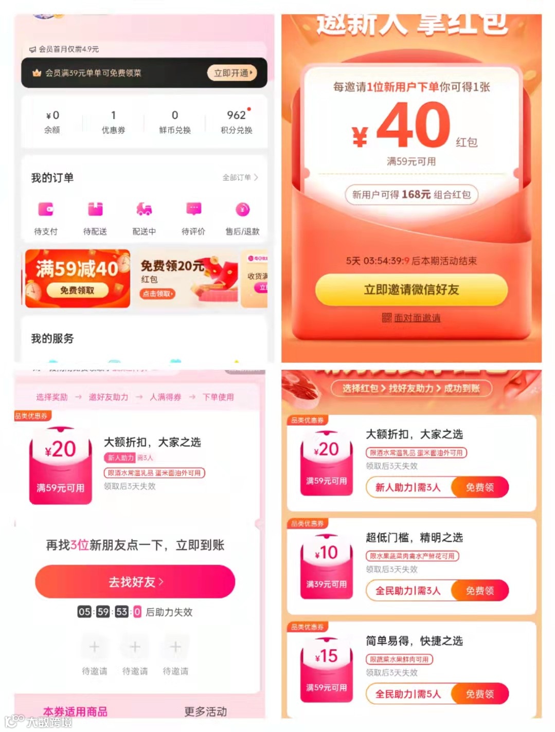 ① 邀好友领40大额优惠券:以40元大额优惠券促进用户自发分享,通过用户的社交圈裂变分享,吸引新用户注册和下单,新用户首次下单金额达到29元,确认收货后,邀请人即可领取59-40的大额优惠券,新用户也能获得49-20的复购券。