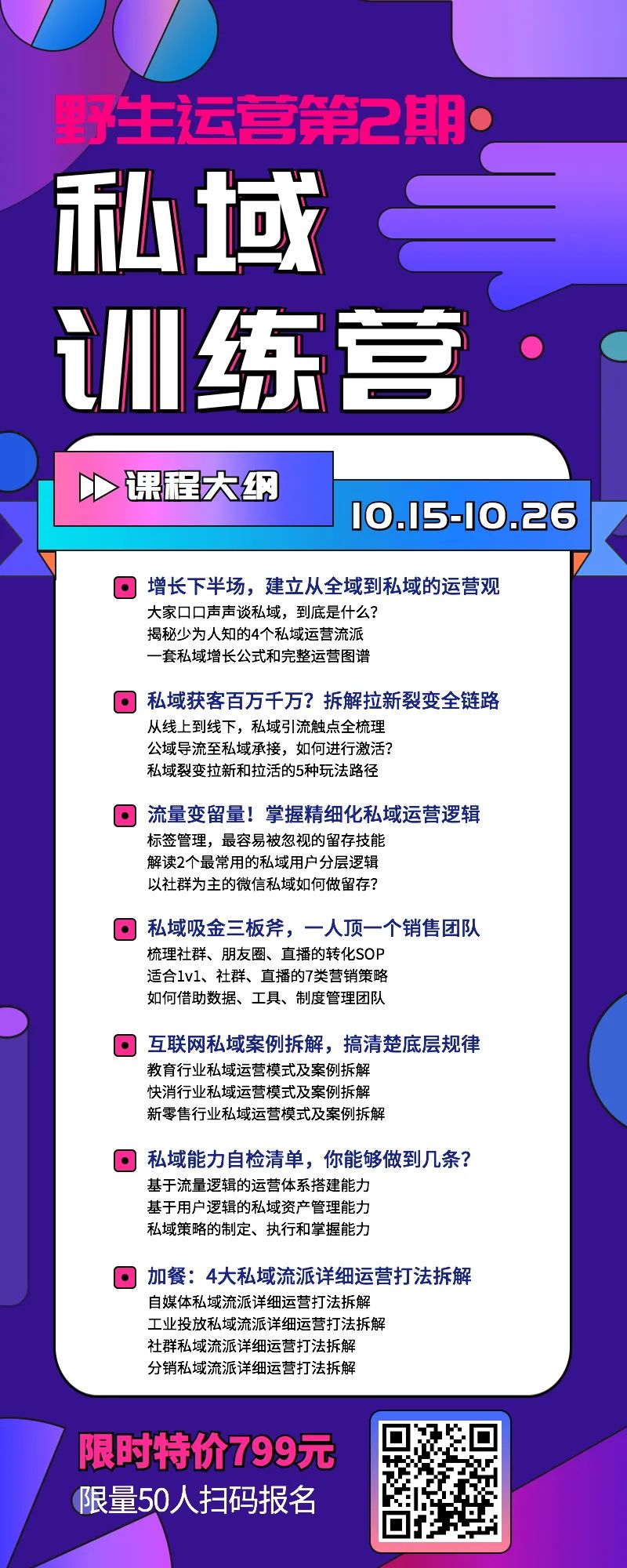 独孤菌和松月将自身多年运营经验,结合互联网等多个行业的优秀私域案例,联合打磨输出成本次私域留量增长训练营,采用“小班教学+double双师制+社群服务”的学习机制,帮学习者快速建立私域留量认知,具备私域操盘能力,戳这里了解更多课程信息:野生运营第2期私域留量增长训练营启动招生!限50人!