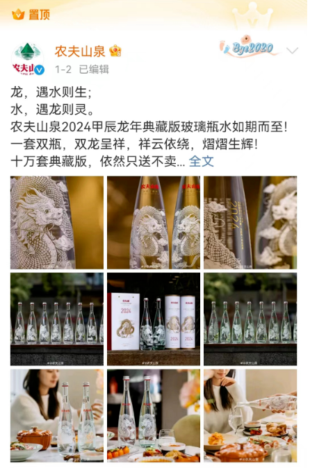 农夫山泉龙年生肖瓶于2024年初如约而至,延续了自2016年起每年一度的生肖主题瓶装水传统。尽管已历经九载,这款独特的包装设计依然如同拆封神秘盲盒般,带给人们期待与惊喜,充分展现了农夫山泉在创意包装领域的深厚功力。