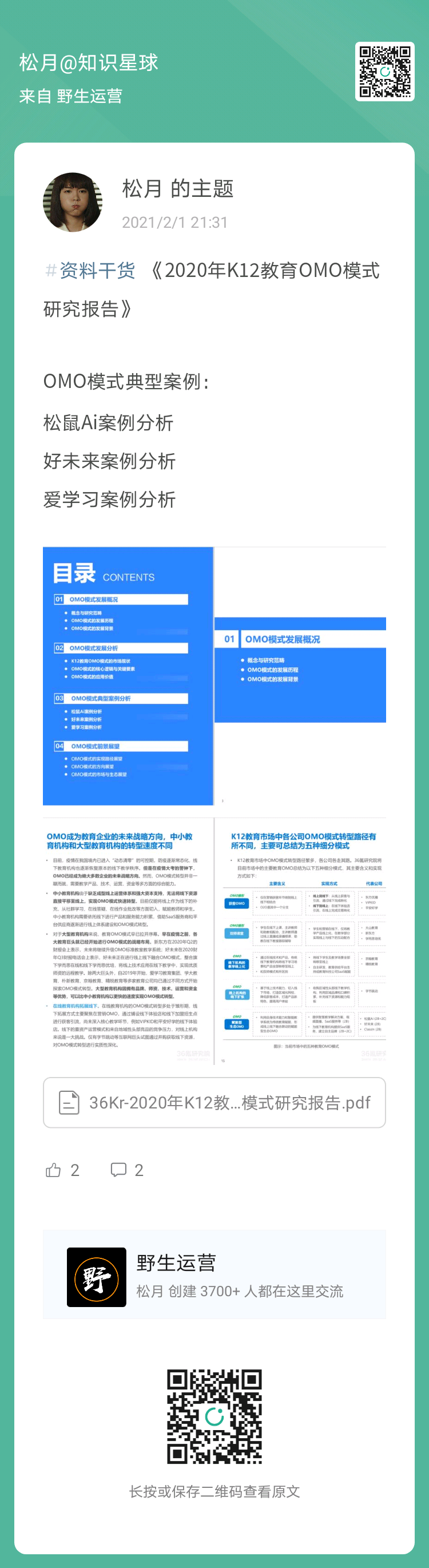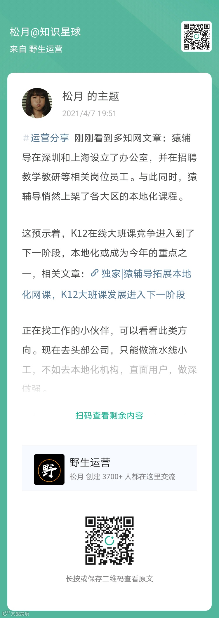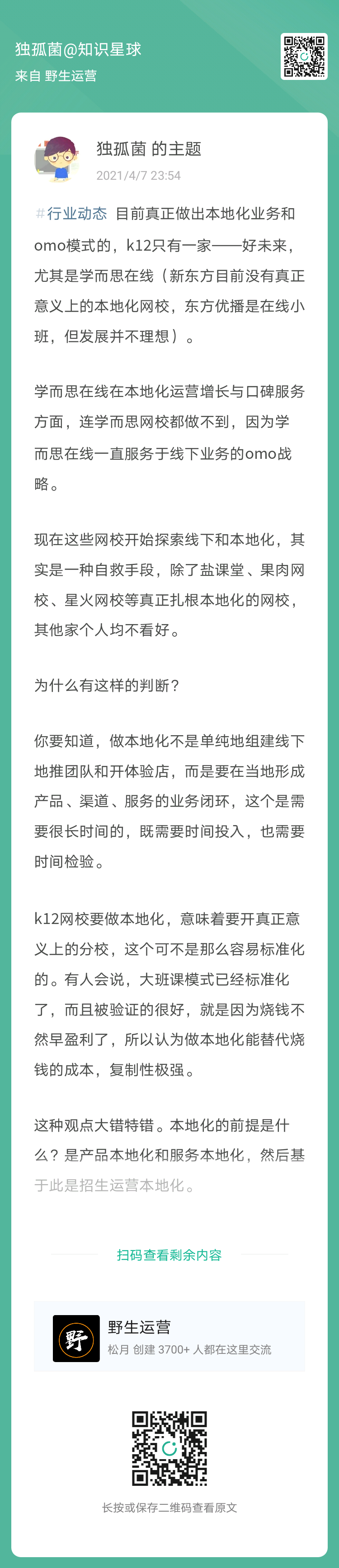 欢迎加入野生运营星球,每周一次快闪分享、教育圈一手资料、1V1答疑……等硬核干货,而且还能一次入手包括 《2020年教育圈增长案例合集》、3508 个在线教育圈案例合集全库、70 页下沉市场观察合集、95 场群分享的音频+逐字稿、N多运营工具包和资料,就问你一句,值不值?