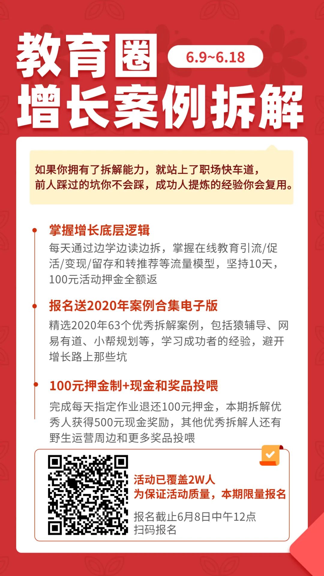 第16期案例拆解开始报名,活动时间6月9日~6月18日(端午节开始拆解),为了保证活动体验,限量报名,扫码占座: