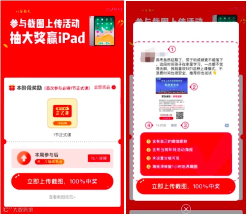 比如掌门一对一的“抽大奖赢iPad”活动,上传转介绍分享截图,就可以参与抽奖有机会中iPad,总之选品价值越高,越容易进行宣传,吸引力越强。