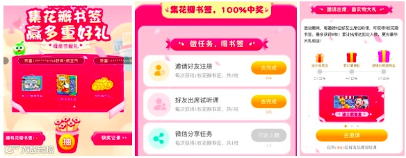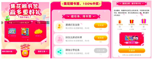 比如豌豆思维,其在转介绍活动里设计了“集花瓣书签”的抽奖玩法,设计了微信分享、邀请注册和邀请听课三种任务,用花瓣书签兑换抽奖机会,任务次数对应1次、4次和6次,大大增加参与率和分享率。
