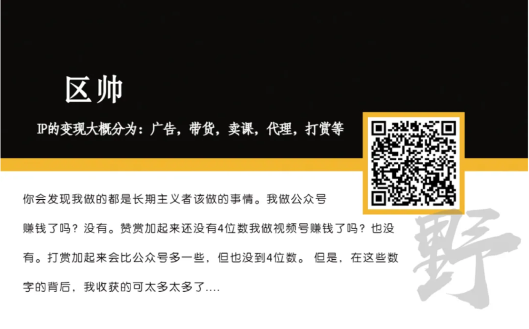 任何IP的变现大概分为:广告,电商带货,卖课,代理,打赏,卖服务(代运营,咨询)。