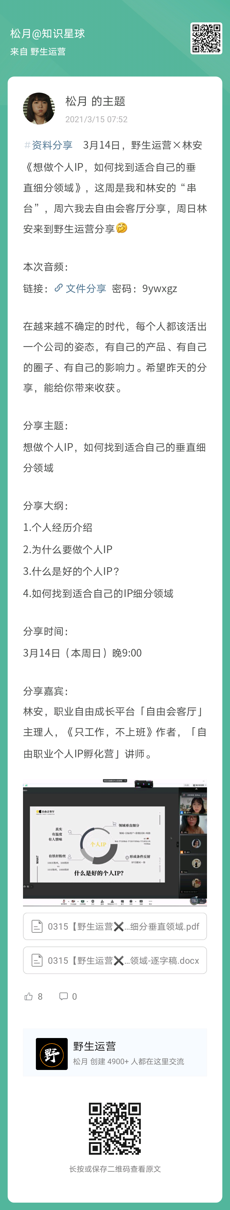 关于IP打造,野生运营曾组织过专题分享,野生运营×林安《想做个人IP,如何找到适合自己的垂直细分领域》。分享嘉宾,林安,职业自由成长平台「自由会客厅」主理人,《只工作,不上班》作者,「自由职业个人IP孵化营」讲师。