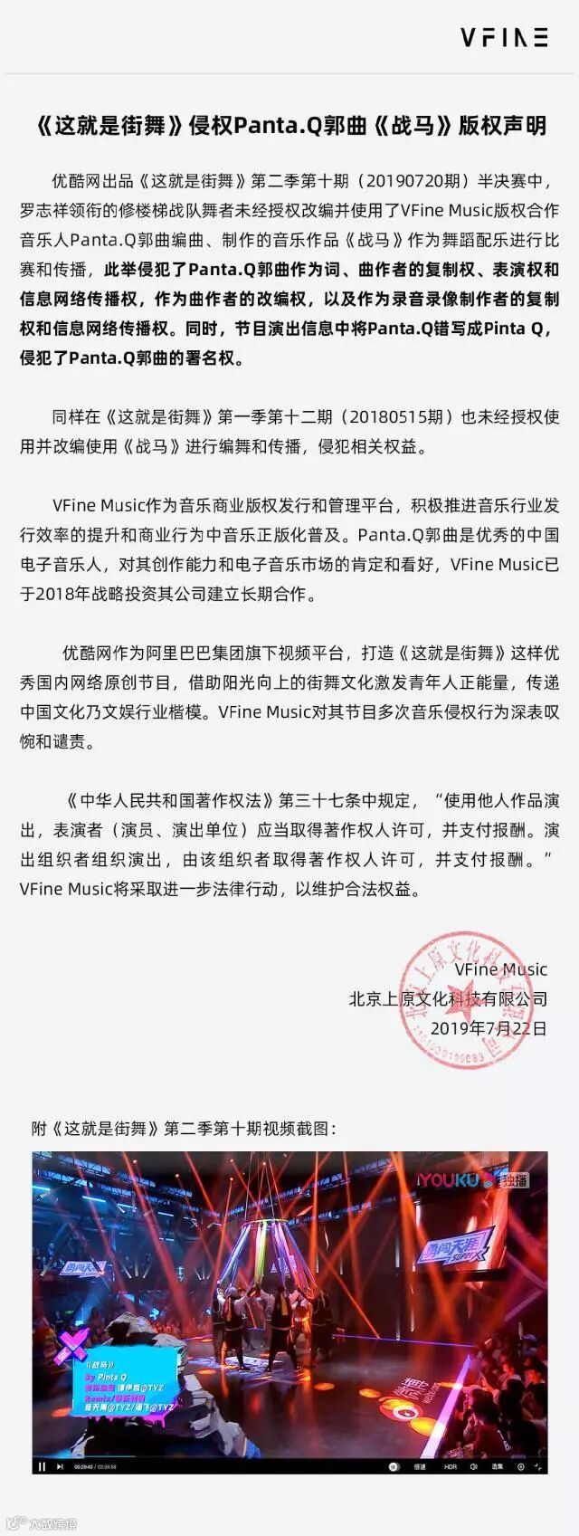 7月22日,VFine Music发布声明,称优酷出品的《这!就是街舞》第二季第十期(20199720期)在半决赛中,未经授权改编并使用了VFine Music版权合作音乐人Panta.Q郭曲编曲、制作的音乐作品《战马》作为比赛舞蹈配曲进行商业传播,侵犯了Panta.Q郭曲的相关权益。