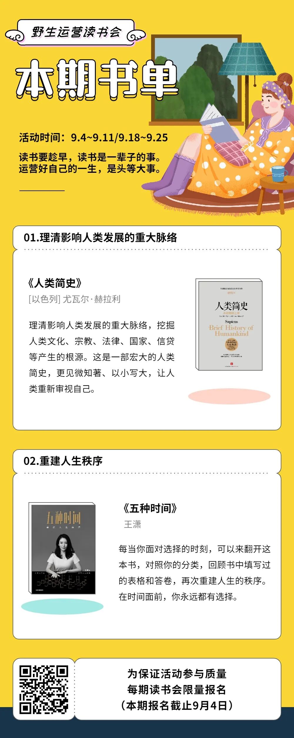 下期读书会我们一起共读《人类简史》和《五种时间》,明天开始共读,报名截止至今晚8点,报名扫码咯: